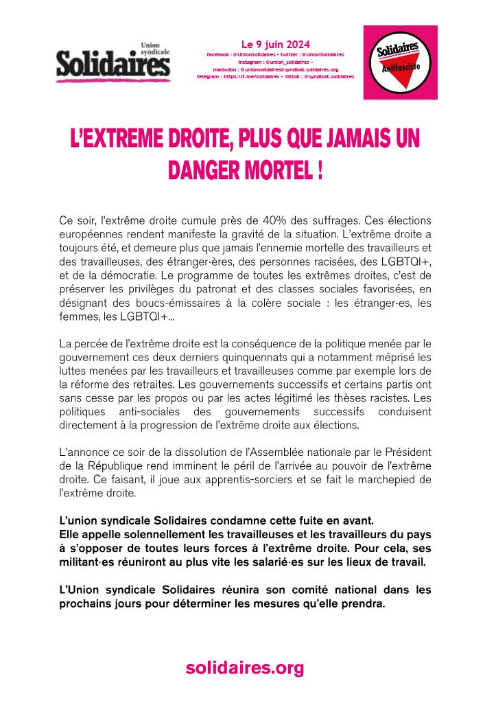l’extrême droite, plus que jamais un danger mortel !Ce soir, l’extrême droite cumule près de 40% des suffrages. Ces élections européennes rendent manifeste la gravité de la situation. L’extrême droite a toujours été, et demeure plus que jamais l’ennemie mortelle des travailleurs et des travailleuses, des étranger⋅ères, des personnes racisées, des LGBTQI+, et de la démocratie. Le programme de toutes les extrêmes droites, c’est de préserver les privilèges du patronat et des classes sociales favorisées, en désignant des boucs-émissaires à la colère sociale : les étranger⋅es, les femmes, les LGBTQI+... La percée de l’extrême droite est la conséquence de la politique menée par le gouvernement ces deux derniers quinquennats qui a notamment méprisé les luttes menées par les travailleurs et travailleuses comme par exemple lors de la réforme des retraites. Les gouvernements successifs et certains partis ont sans cesse par les propos ou par les actes légitimé les thèses racistes. Les politiques anti-sociales des gouvernements successifs conduisent directement à la progression de l’extrême droite aux élections. L’annonce ce soir de la dissolution de l’Assemblée nationale par le Président de la République rend imminent le péril de l’arrivée au pouvoir de l’extrême droite. Ce faisant, il joue aux apprentis-sorciers et se fait le marchepied de l’extrême droite. L’union syndicale Solidaires condamne cette fuite en avant. Elle appelle solennellement les travailleuses et les travailleurs du pays à s’opposer de toutes leurs forces à l’extrême droite. Pour cela, ses militant⋅es réuniront au plus vite les salarié⋅es sur les lieux de travail. L’Union syndicale Solidaires réunira son comité national dans les prochains jours pour déterminer les mesures qu’elle prendra.L’extrême droite, plus que jamais un danger mortel !