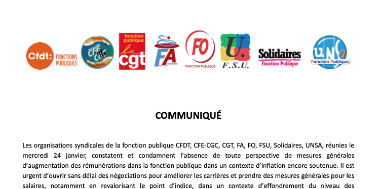 Les organisations syndicales de la fonction publique CFDT, CFE-CGC, CGT, FA, FO, FSU, Solidaires, UNSA, réunies le mercredi 24 janvier, constatent et condamnent l’absence de toute perspective de mesures générales d’augmentation des rémunérations dans la fonction publique dans un contexte d’inflation encore soutenue. Il est urgent d’ouvrir sans délai des négociations pour améliorer les carrières et prendre des mesures générales pour les salaires, notamment en revalorisant le point d’indice, dans un contexte d’effondrement du niveau des rémunérations des agent·es publics.