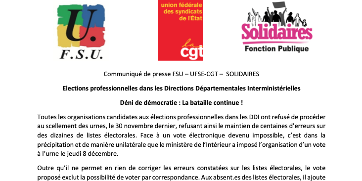La CGT, la FSU et Solidaires sont absolument aux côtés de tous les personnels, celles et ceux qui pourront légitimement exprimer leurs suffrages comme celles et ceux qui seront privé.es de leur droit de désigner leurs représentant.es.