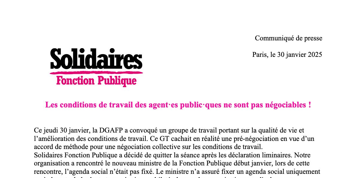 Ce jeudi 30 janvier, la DGAFP a convoqué un groupe de travail portant sur la qualité de vie et l’amélioration des conditions de travail. Ce GT cachait en réalité une pré-négociation en vue d’un accord de méthode pour une négociation collective sur les conditions de travail. Solidaires Fonction Publique a décidé de quitter la séance après les déclaration liminaires. Notre organisation a rencontré le nouveau ministre de la Fonction Publique début janvier, lors de cette rencontre, l’agenda social n’était pas fixé. Le ministre n’a assuré fixer un agenda social uniquement après le vote du budget et une réunion multilatérale avec les organisations syndicales pour déterminer les priorités. Rien de cela n’est encore arrivé ! La méthode choisit par la DGAFP de passage en force sur le sujet ne convient pas !