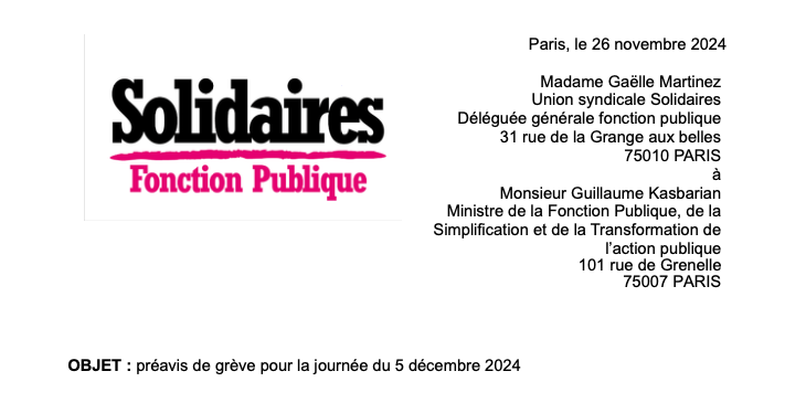 L’Union syndicale Solidaires Fonction publique dépose un préavis de grève pour la période allant du 4 décembre 2024 19h au 6 décembre 2024 à 9h.