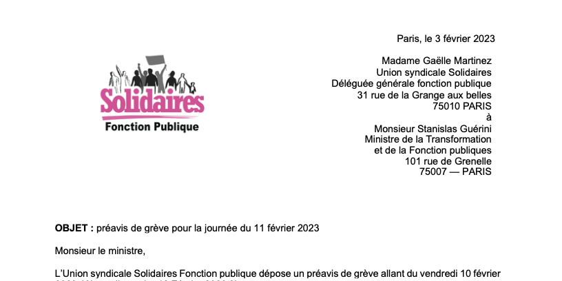 L’Union syndicale Solidaires Fonction publique dépose un préavis de grève allant du vendredi 10 février 2023 19h au dimanche 12 Février 2023 9h.