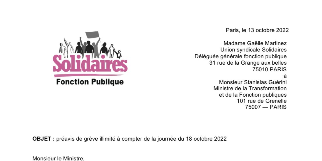 L’Union syndicale Solidaires Fonction publique dépose un préavis de grève illimité à compter de la journée du 18 octobre 2022 (de 0 h à 24 h).