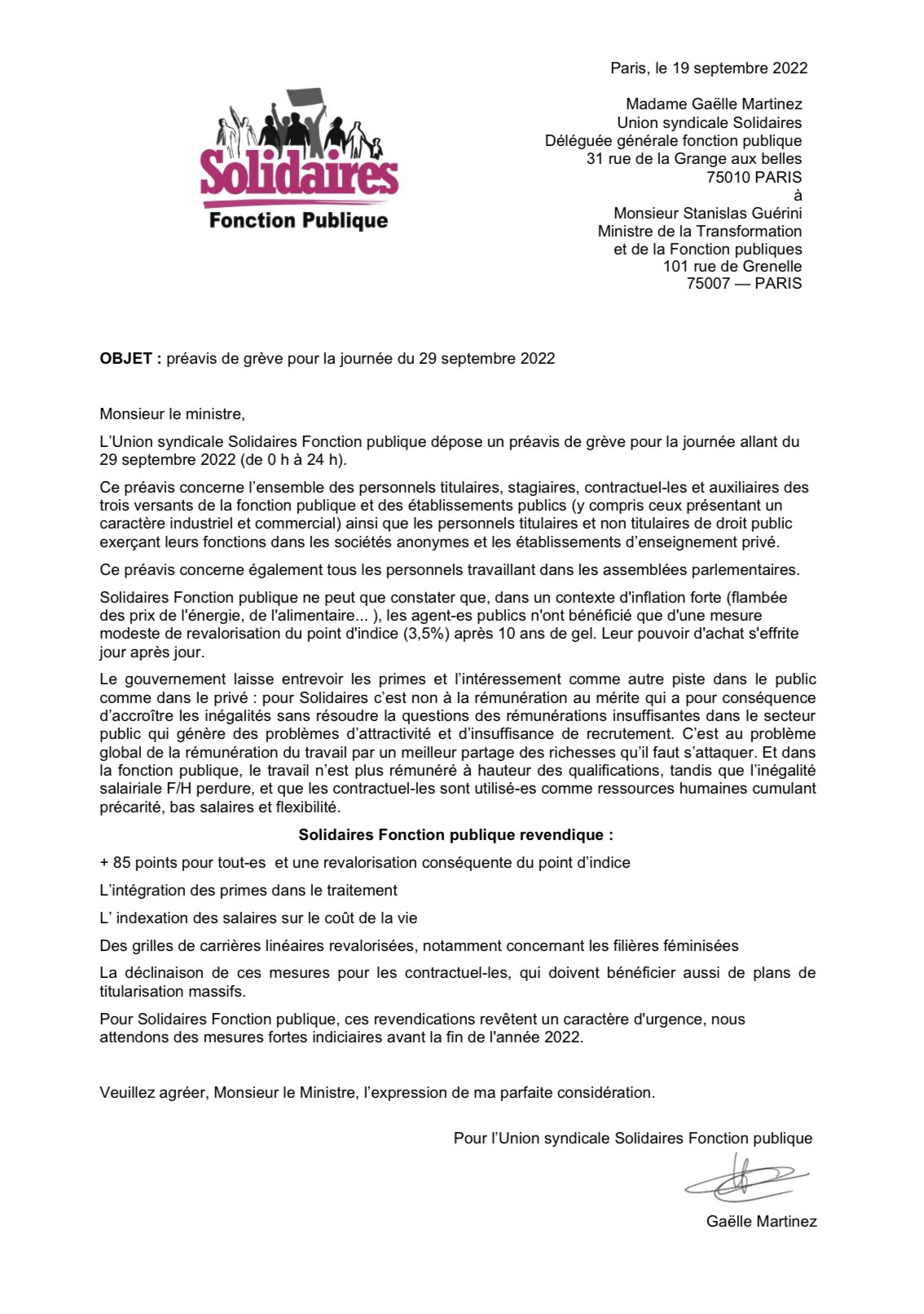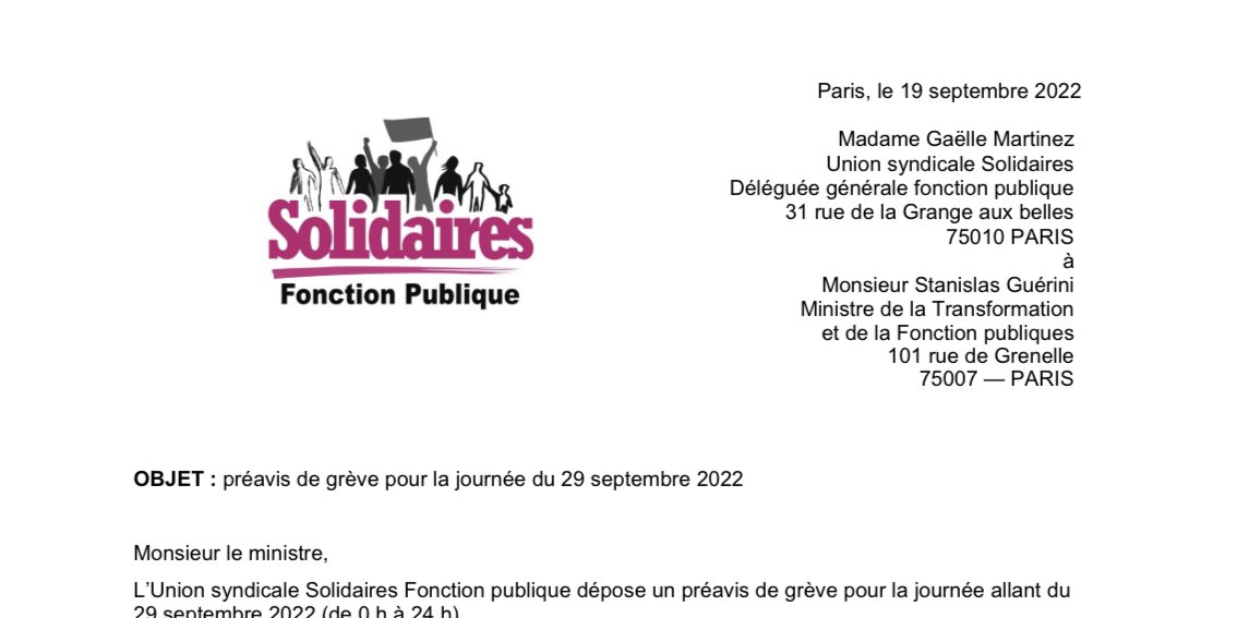 L’Union syndicale Solidaires Fonction publique dépose un préavis de grève pour la journée allant du 29 septembre 2022 (de 0 h à 24 h).
