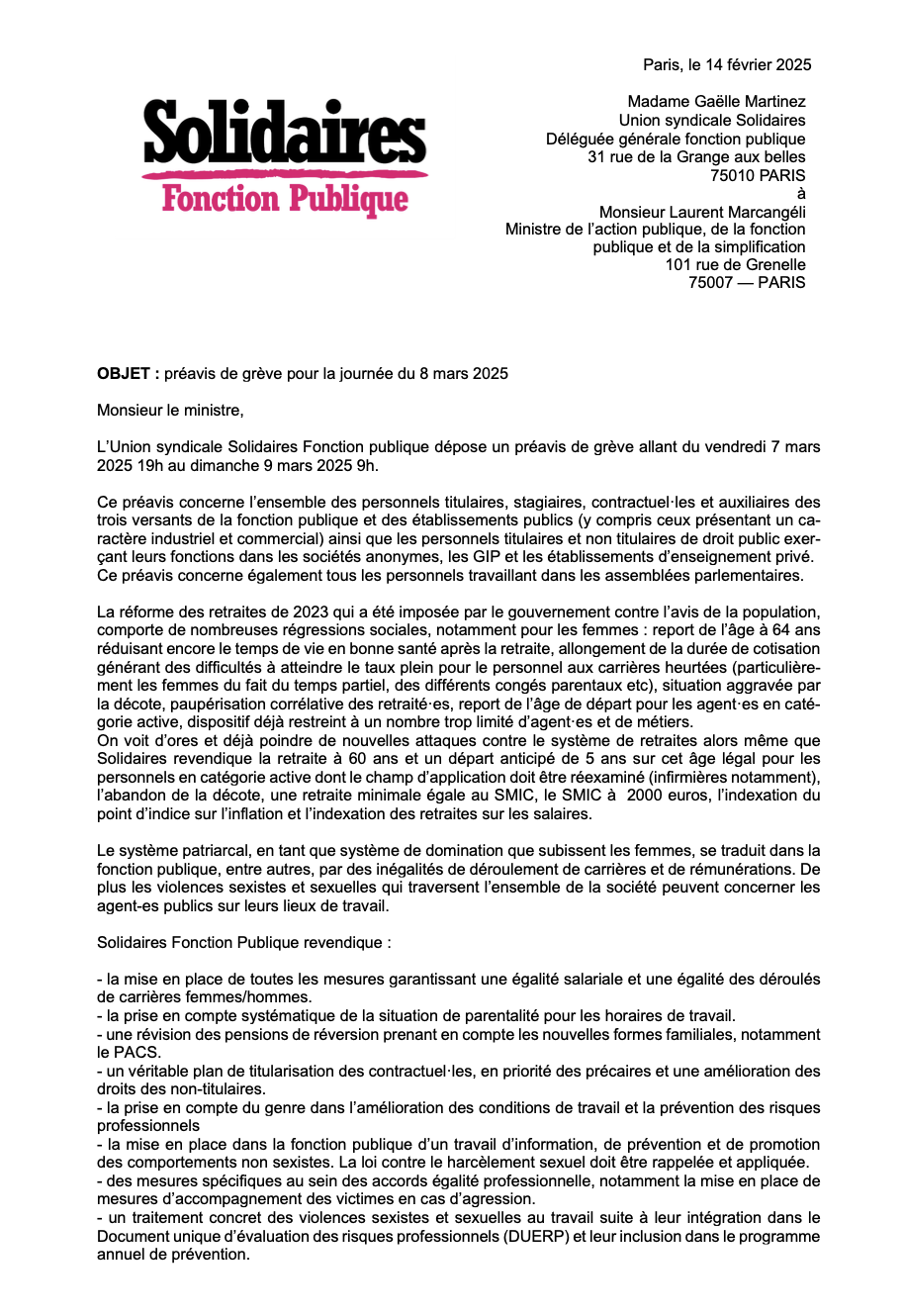 L’Union syndicale Solidaires Fonction publique dépose un préavis de grève allant du vendredi 7 mars 2025 19h au dimanche 9 mars 2025 9h.