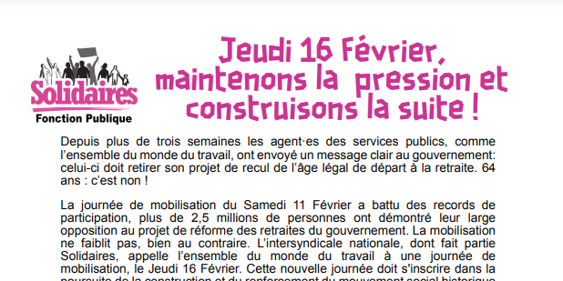 La journée de mobilisation du Samedi 11 Février a battu des records de participation, plus de 2,5 millions de personnes ont démontré leur large opposition au projet de réforme des retraites du gouvernement. La mobilisation ne faiblit pas, bien au contraire. L’intersyndicale nationale, dont fait partie Solidaires, appelle l’ensemble du monde du travail à une journée de mobilisation, le Jeudi 16 Février. Cette nouvelle journée doit s'inscrire dans la poursuite de la construction et du renforcement du mouvement social historique que nous connaissons.