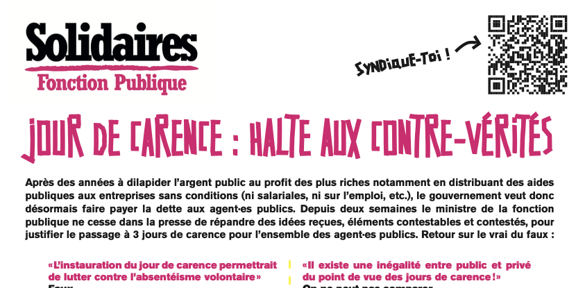 Après des années à dilapider l’argent public au profit des plus riches notamment en distribuant des aides publiques aux entreprises sans conditions (ni salariales, ni sur l’emploi, etc.), le gouvernement veut donc désormais faire payer la dette aux agent·es publics. Depuis deux semaines le ministre de la fonction publique ne cesse dans la presse de répandre des idées reçues, éléments contestables et contestés, pour justifier le passage à 3 jours de carence pour l’ensemble des agent·es publics.