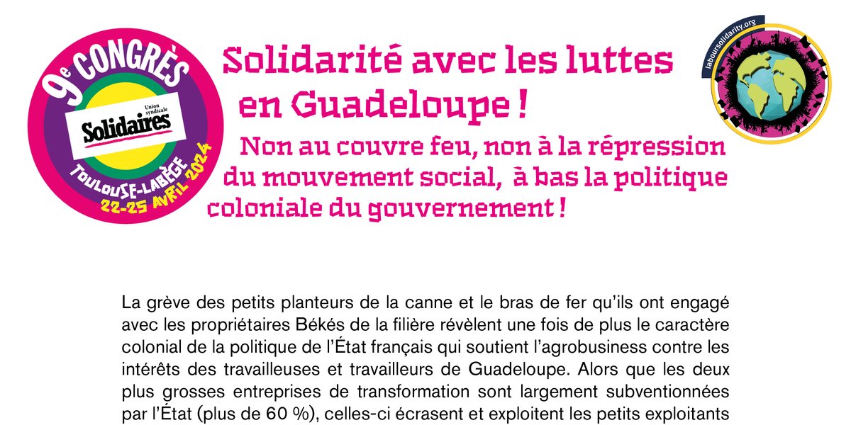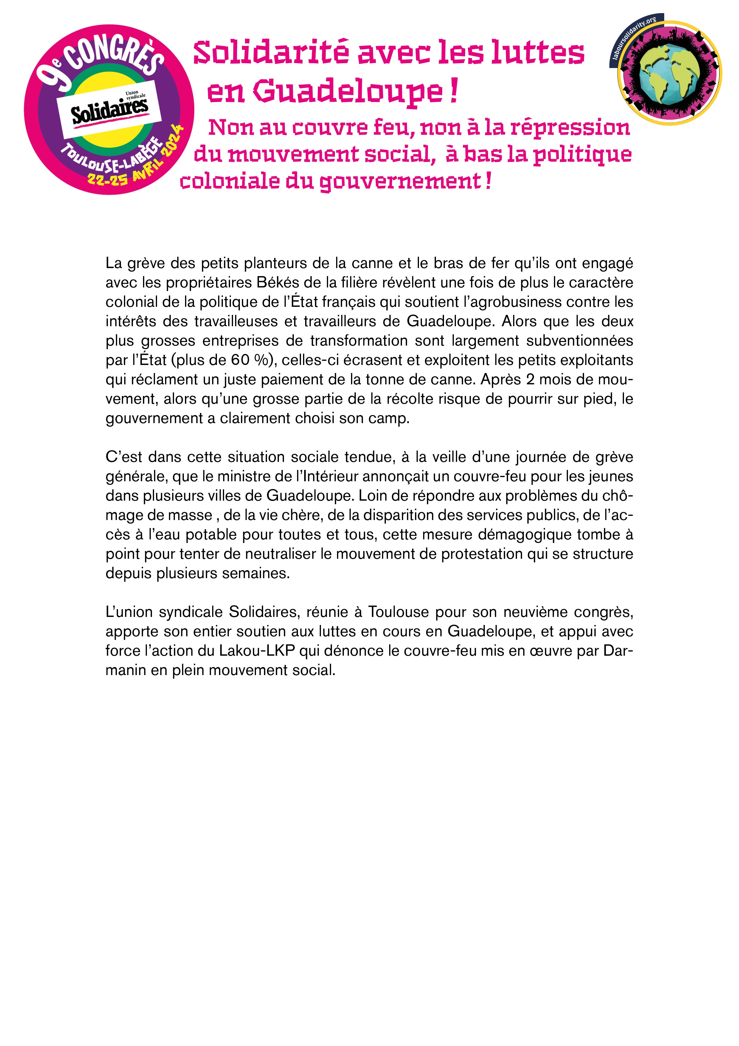 L’union syndicale Solidaires, réunie à Toulouse pour son neuvième congrès, apporte son entier soutien aux luttes en cours en Guadeloupe, et appui avec force l’action du Lakou-LKP qui dénonce le couvre-feu mis en œuvre par Darmanin en plein mouvement social.