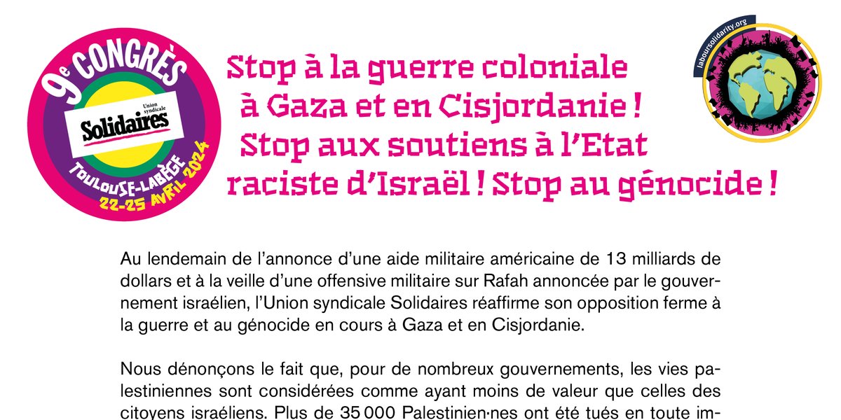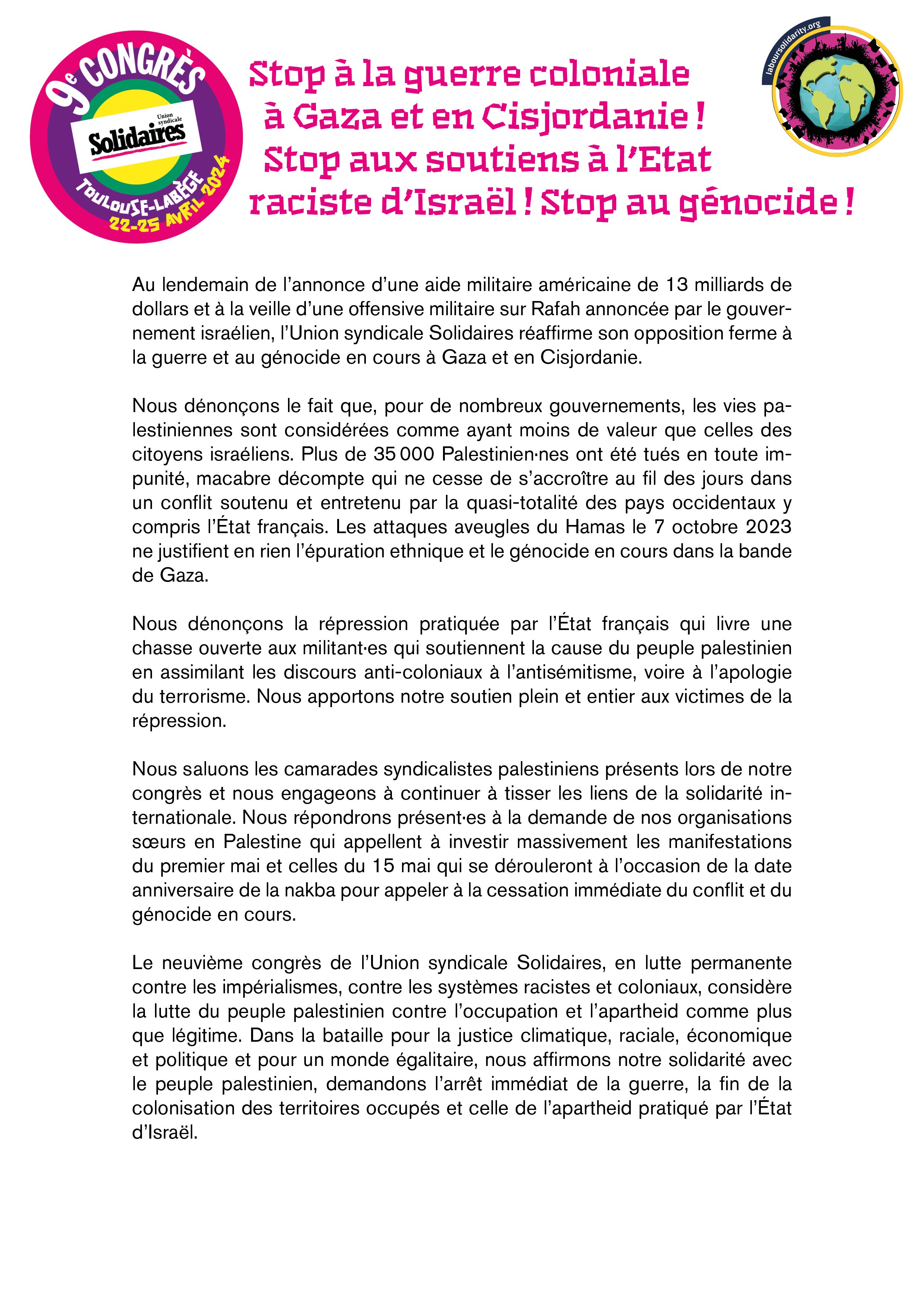Le neuvième congrès de l’Union syndicale Solidaires, en lutte permanente contre les impérialismes, contre les systèmes racistes et coloniaux, considère la lutte du peuple palestinien contre l’occupation et l’apartheid comme plus que légitime. Dans la bataille pour la justice climatique, raciale, économique et politique et pour un monde égalitaire, nous affirmons notre solidarité avec le peuple palestinien, demandons l’arrêt immédiat de la guerre, la fin de la colonisation des territoires occupés et celle de l’apartheid pratiqué par l’État d’Israël.