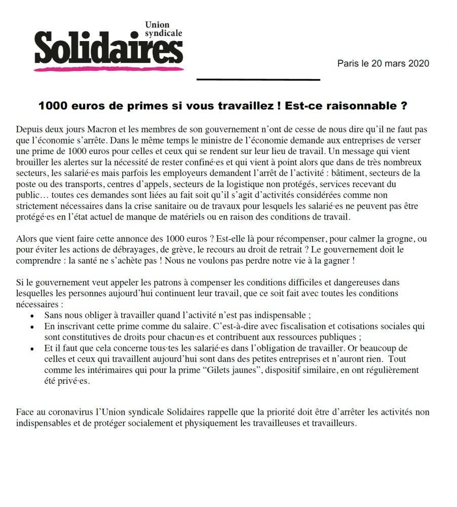Depuis deux jours Macron et les membres de son gouvernement n’ont de cesse de nous dire qu’il ne faut pas que l’économie s’arrête. Dans le même temps le ministre de l’économie demande aux entreprises de verser une prime de 1000 euros pour celles et ceux qui se rendent sur leur lieu de travail. Un message qui vient brouiller les alertes sur la nécessité de rester confiné·es et qui vient à point alors que dans de très nombreux secteurs, les salarié·es mais parfois les employeurs demandent l’arrêt de l’activité : bâtiment, secteurs de la poste ou des transports, centres d’appels, secteurs de la logistique non protégés, services recevant du public… toutes ces demandes sont liées au fait soit qu’il s’agit d’activités considérées comme non strictement nécessaires dans la crise sanitaire ou de travaux pour lesquels les salarié·es ne peuvent pas être protégé·es en l’état actuel de manque de matériels ou en raison des conditions de travail.