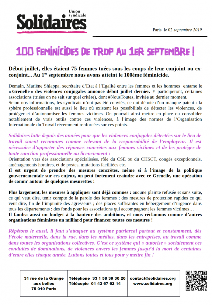 Solidaires lutte depuis des années pour que les violences conjugales détectées sur le lieu de travail soient reconnues comme relevant de la responsabilité de l’employeur. Il est nécessaire d’apporter des réponses concrètes aux femmes victimes et de les protéger de toute sanction professionnelle ou licenciement