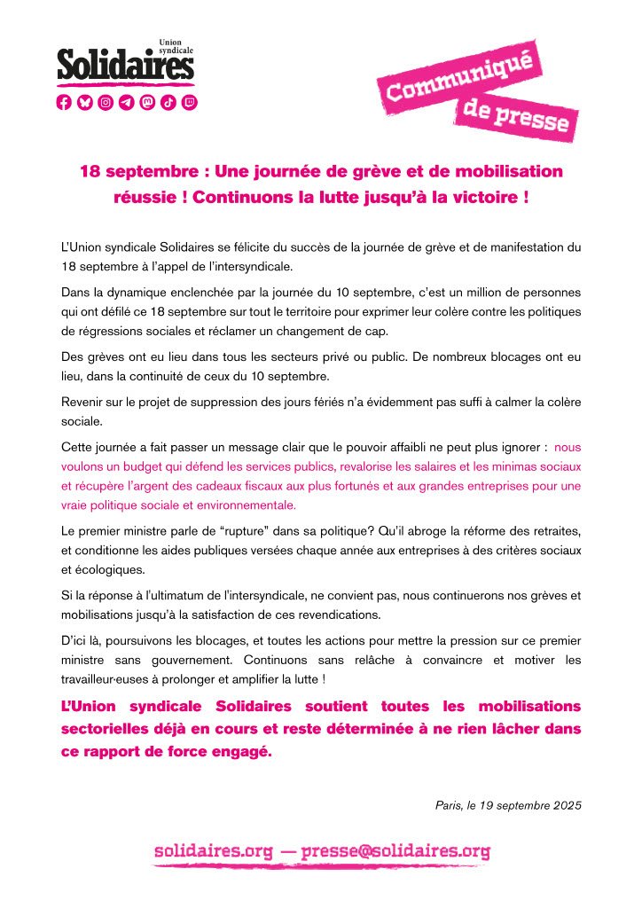 L’Union syndicale Solidaires se félicite du succès de la journée de grève et de manifestation du 18 septembre à l’appel de l’intersyndicale.