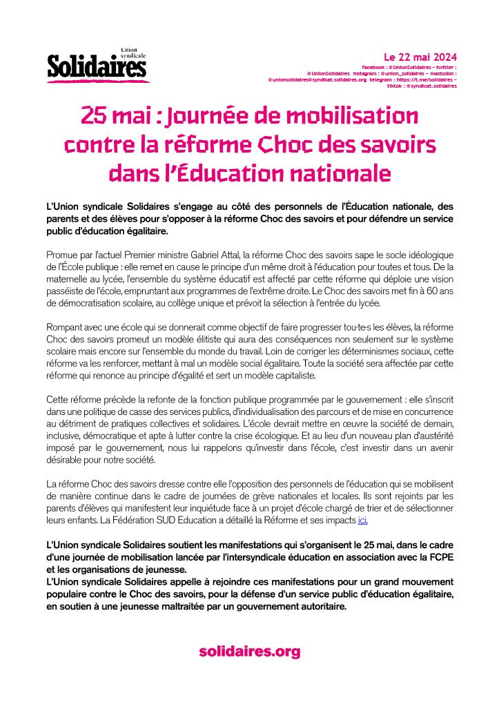 L’Union syndicale Solidaires s’engage au côté des personnels de l’Éducation nationale, des parents et des élèves pour s’opposer à la réforme Choc des savoirs et pour défendre un service public d’éducation égalitaire.