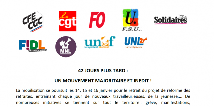 La mobilisation se poursuit les 14, 15 et 16 janvier pour le retrait du projet de réforme des retraites, entraînant chaque jour de nouveaux travailleur.euses, de la jeunesse,... De nombreuses initiatives se tiennent sur tout le territoire : grève, manifestations, rassemblements, piquets de grève, etc… rassemblant à nouveau plusieurs centaines de milliers de personnes.
