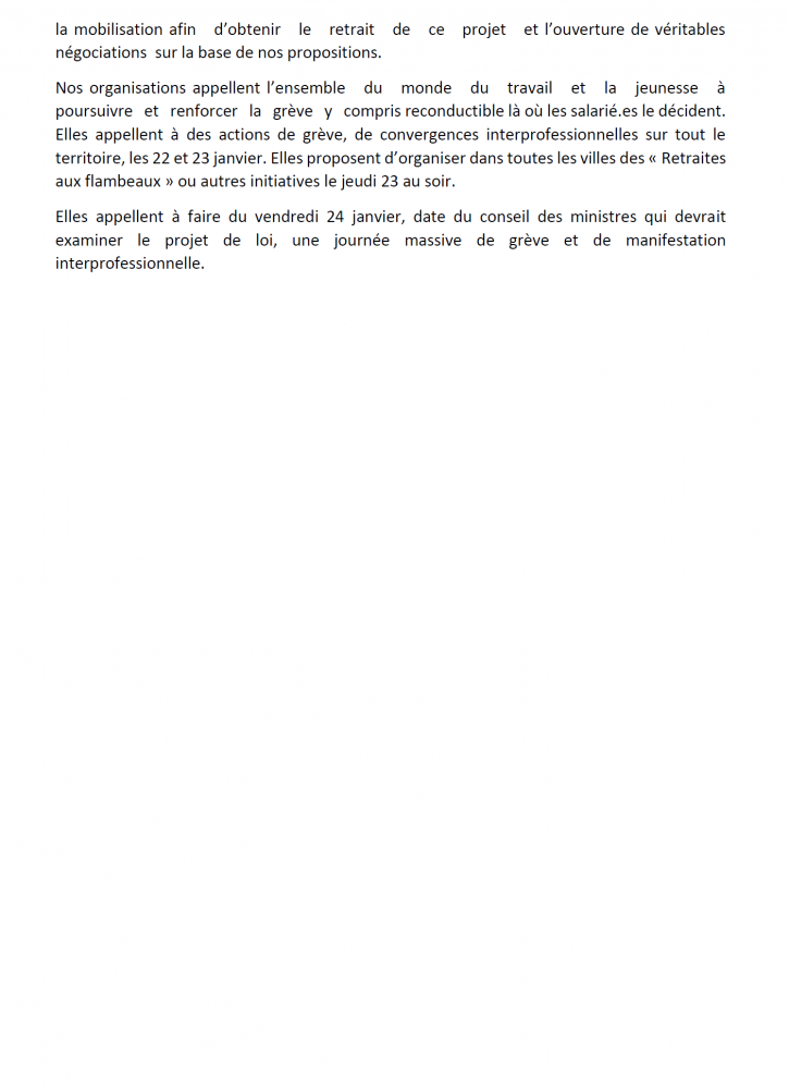 Malgré les annonces du premier ministre et après 6 semaines d’un mouvement social inédit, dont nous nous félicitons, la population soutient toujours majoritairement la mobilisation contre ce projet absurde et injuste (60% de soutien, au baromètre Harris Interactive du 14 janvier). La communication gouvernementale visant à nous expliquer à nouveau que ce projet est « juste et simple » se heurte à une opinion publique qui voit bien qu’il s’agit de nous faire travailler plus longtemps pour des pensions plus basses.