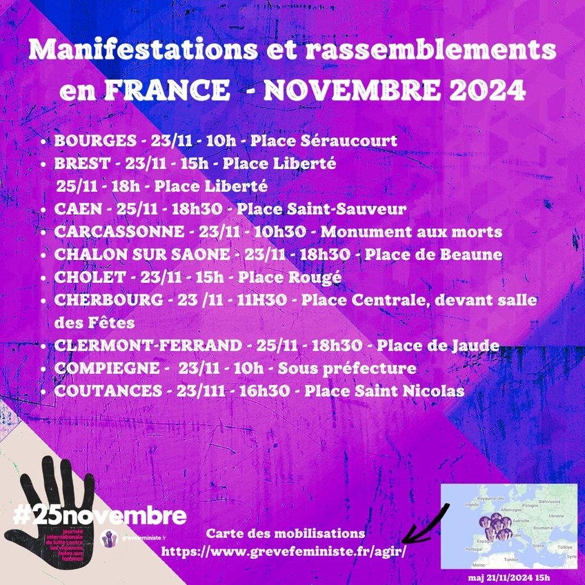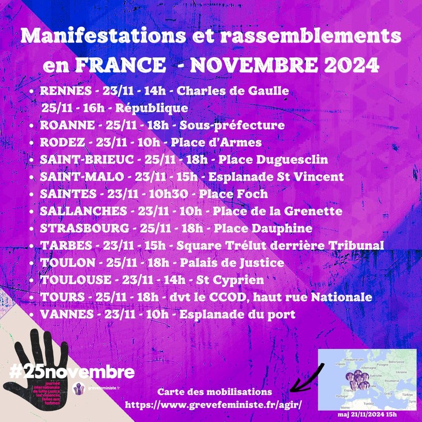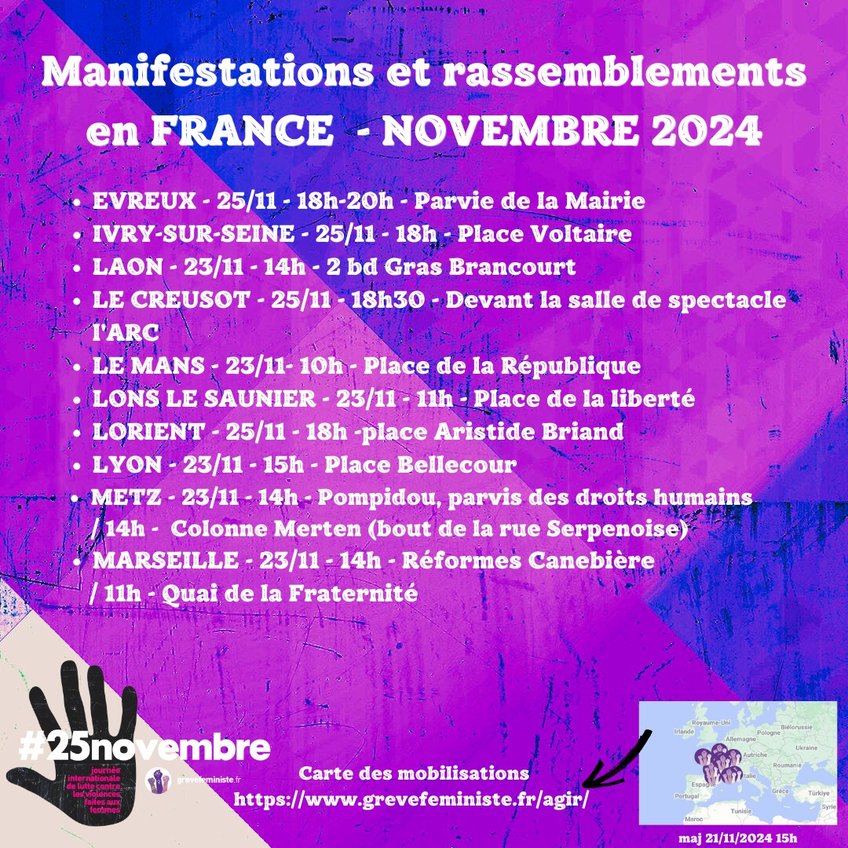 Luttons pour que toutes les femmes, toutes les personnes LGBTQIA+, puissent vivre sans crainte. Parce que quand une femme se lève, c’est le monde entier qui bouge. Ensemble, transformons la société ! Rendez-vous dans les rues, le 23, 24 ou 25 novembre.