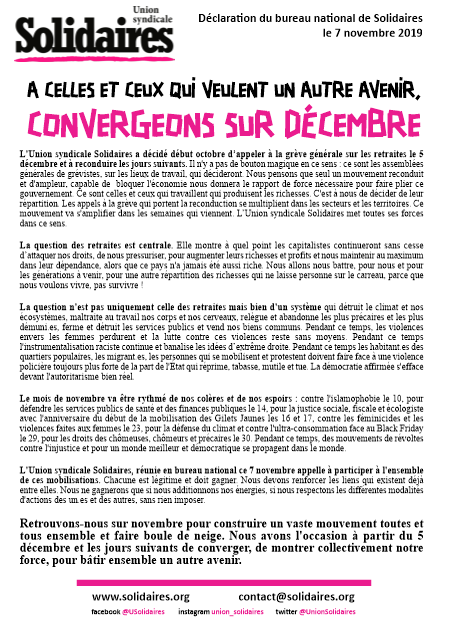 L'Union syndicale Solidaires, réunie en bureau national ce 7 novembre appelle à participer à l'ensemble de ces mobilisations.