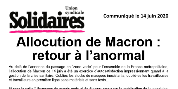 Au delà de l’annonce du passage en “zone verte” pour l’ensemble de la France métropolitaine, l’allocution de Macron ce 14 juin a été un exercice d’autosatisfaction impressionnant quand à la gestion de la crise sanitaire. Oubliés les stocks de masques inexistants, oublié-es les travailleuses et travailleurs en première ligne sans matériels et sans tests…