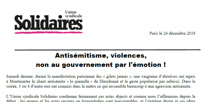 L’Union syndicale Solidaires condamne fermement ces actes abjects et comme nous l’affirmions depuis le début : les propos et les actes racistes ou homophobes sont inacceptables, et l’extrême droite et ses idées n’ont pas leur place dans ce mouvement social qui réclame avant tout une meilleure répartition des richesses. Nous saluons et sommes solidaires de celles et ceux qui ont chassé les fascistes des différentes manifestations.
