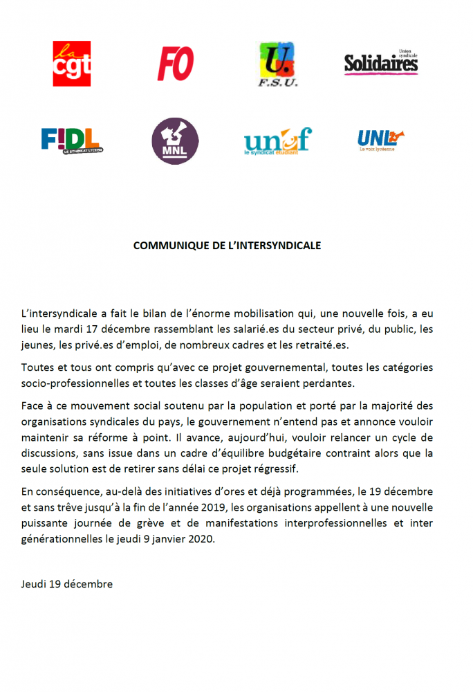 En conséquence, au-delà des initiatives d’ores et déjà programmées, le 19 décembre et sans trêve jusqu’à la fin de l’année 2019, les organisations appellent à une nouvelle puissante journée de grève et de manifestations interprofessionnelles et inter générationnelles le jeudi 9 janvier 2020.