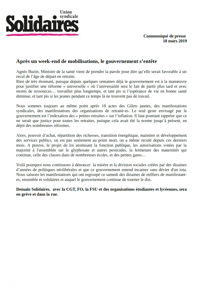 Nous sommes toujours au même point après 18 actes des Gilets jaunes, des manifestations syndicales, des manifestations des organisations de retraité-es. Le seul geste envisagé par le gouvernement est l’indexation des « petites retraites » sur l’inflation. Il faut pourtant rappeler que ce ne serait que justice pour toutes les retraites, puisque cela avait été la norme jusqu’à présent, en dépit des nombreuses réformes.