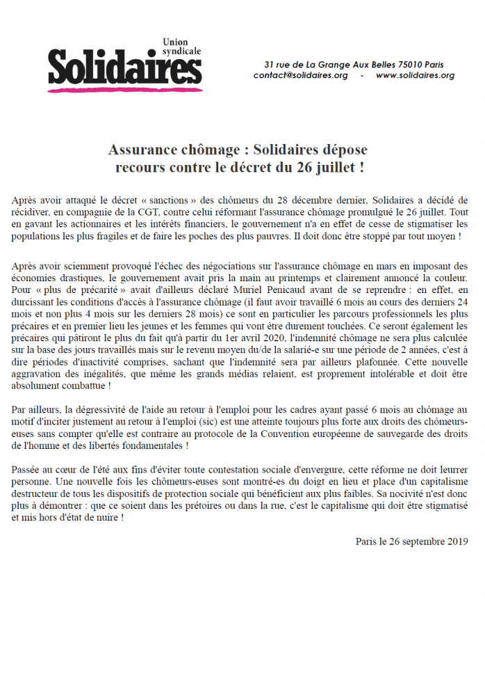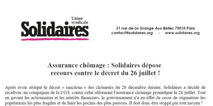 Après avoir attaqué le décret « sanctions » des chômeurs du 28 décembre dernier, Solidaires a décidé de récidiver, en compagnie de la CGT, contre celui réformant l'assurance chômage promulgué le 26 juillet. Tout en gavant les actionnaires et les intérêts financiers, le gouvernement n'a en effet de cesse de stigmatiser les populations les plus fragiles et de faire les poches des plus pauvres. Il doit donc être stoppé par tout moyen !
