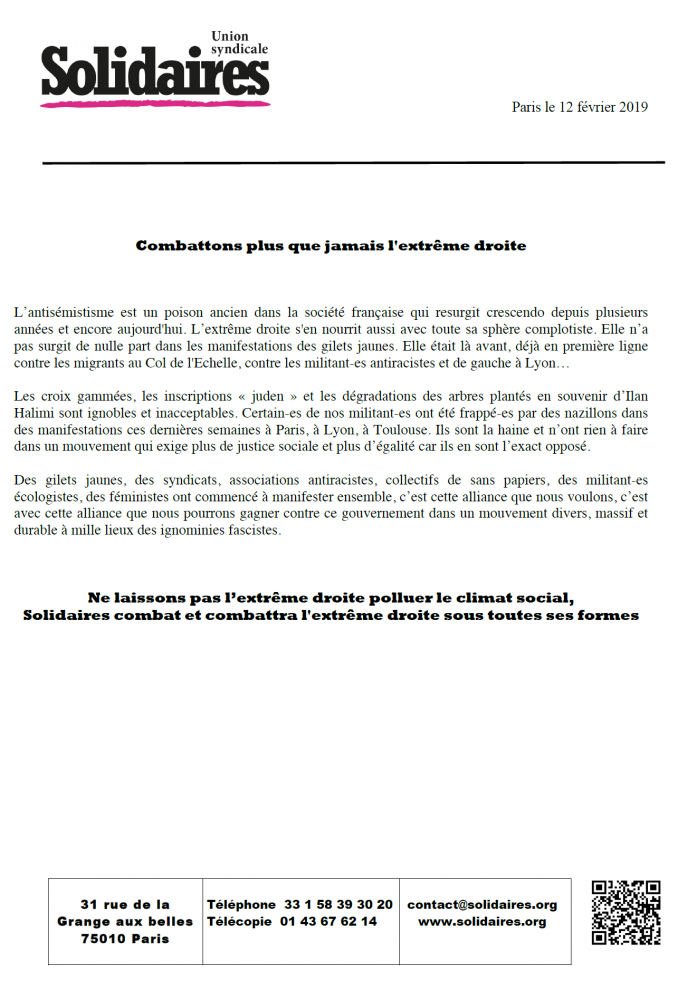 Des gilets jaunes, des syndicats, associations antiracistes, collectifs de sans papiers, des militant-es écologistes, des féministes ont commencé à manifester ensemble, c’est cette alliance que nous voulons, c’est avec cette alliance que nous pourrons gagner contre ce gouvernement dans un mouvement divers, massif et durable à mille lieux des ignominies fascistes.