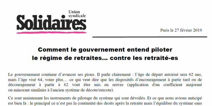 Le gouvernement continue d’avancer ses pions. Il parle clairement : l’âge de départ autorisé sera 62 ans, mais l’âge visé 64, voire plus… ce qui veut dire que les dispositifs d’encouragement à partir tard ou de découragement à partir à 62 vont être mis en œuvre (application d'un coefficient majorant ou minorant similaire à l'ancien système de décote/surcote).