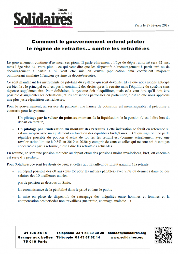 Ce sont maintenant les instruments de pilotage du système qui sont dévoilés. Et ce que nous avions anticipé est bien là : le principal ce n’est pas la continuité des droits après la retraite mais l’équilibre du système sans dépense supplémentaire. Pour Solidaires, le système doit s’équilibrer, mais cela veut dire qu’il doit être possible d’augmenter les cotisations, et les cotisations patronales en particulier, c’est ce que nous appelons une plus juste répartition des richesses.