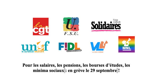 C’est pourquoi la CGT, l’Union syndicale Solidaires, la FSU, l’UNEF, la VL, la FIDL et le MNL appellent dès à présent à une journée de grève interprofessionnelle le jeudi 29 septembre qui doit s’inscrire dans une mobilisation large et dans la durée.