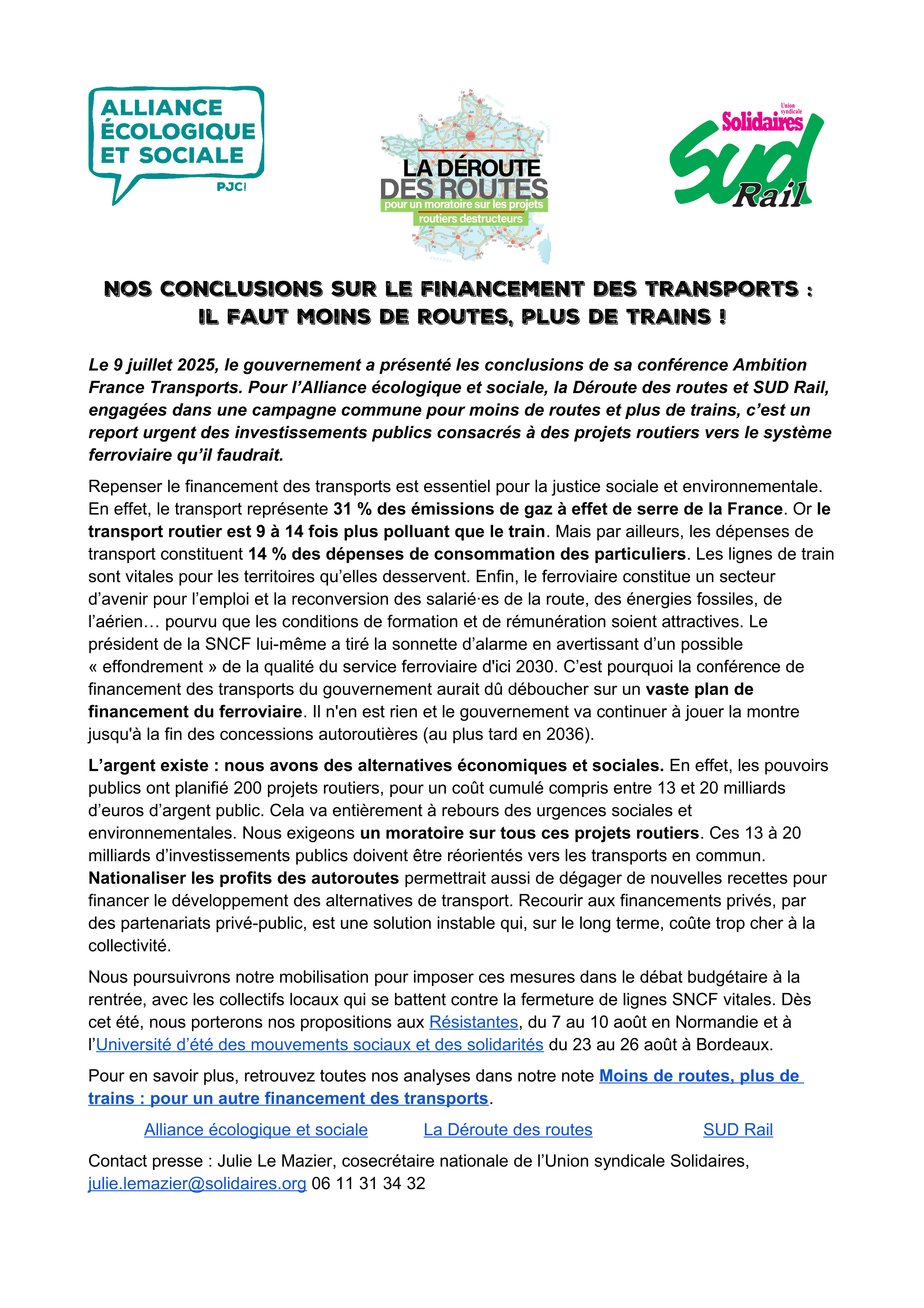 Nous poursuivrons notre mobilisation pour imposer ces mesures dans le débat budgétaire à la rentrée, avec les collectifs locaux qui se battent contre la fermeture de lignes SNCF vitales. Dès cet été, nous porterons nos propositions aux Résistantes, du 7 au 10 août en Normandie et à l’Université d’été des mouvements sociaux et des solidarités du 23 au 26 août à Bordeaux.