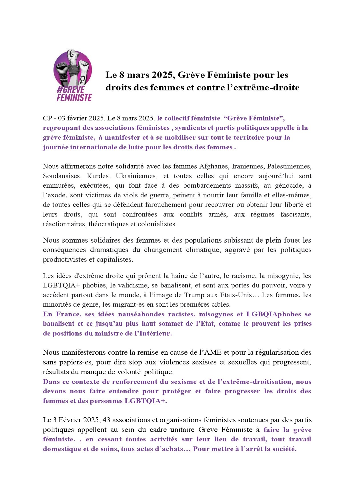 CP - 03 février 2025. Le 8 mars 2025, le collectif féministe “Grève Féministe”, regroupant des associations féministes , syndicats et partis politiques appelle à la grève féministe, à manifester et à se mobiliser sur tout le territoire pour la journée internationale de lutte pour les droits des femmes .