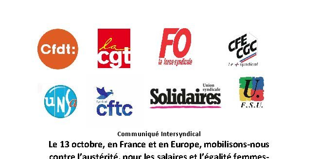 L’ensemble de ces sujets sont partagés à l’échelle européenne. Nos organisations, avec le mouvement syndical européen, sont mobilisées pour la solidarité, la transition écologique juste et contre les politiques d’austérité. Nos organisations appellent à une journée de mobilisations et de manifestation le vendredi 13 octobre 2023 contre l’austérité et pour l’augmentation des salaires, des pensions et l’égalité femme-homme.