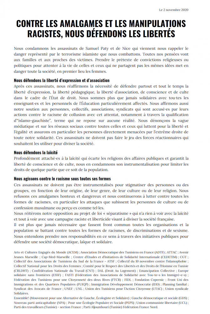 Après ces assassinats, nous réaffirmons la nécessité de défendre partout et tout le temps la liberté d’expression, la liberté pédagogique, la liberté d’association, de conscience et de culte dans le cadre de l’État de droit. Nous sommes plus que jamais solidaires avec tou∙tes les enseignant∙es et les personnels de l’Éducation particulièrement affectés. Nous affirmons aussi notre soutien aux personnes, collectifs, associations, syndicats qui sont accusé∙es par leurs actions contre le racisme de collusion avec cet attentat, notamment à travers la qualification d’“islamo-gauchiste”, terme qui ne repose sur aucune réalité. Nous dénonçons la vague médiatique et sur les réseaux sociaux contre toutes celles et ceux qui luttent pour la liberté et l’égalité et assurons en particulier les personnes directement menacées par l’extrême droite de toute notre solidarité. Ces assassinats ne doivent pas faire le jeu des forces réactionnaires qui souhaitent les utiliser pour diviser la société.