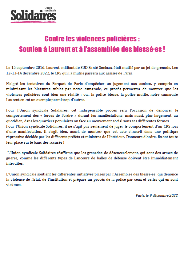Le 15 septembre 2016, Laurent, militant de SUD Santé Sociaux, était mutilé par un jet de grenade. Les 12-13-14 décembre 2022, le CRS qui l'a mutilé passera aux assises de Paris.