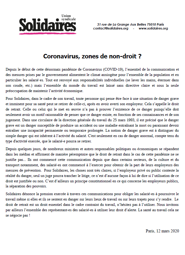 Depuis quelques jours, de nombreux ministres et autres responsables politiques ou économiques se répandent dans les médias et affirment de manière péremptoire que le droit de retrait dans le cas de cette pandémie ne se justifie pas... Ils ont commencé cette communication depuis que dans certains secteurs, de la culture et du transport notamment, des salarié-es ont commencé à l’exercer pour obtenir de la part de leurs employeurs des mesures de prévention. Pour Solidaires, les choses sont très claires, si l’employeur privé ou public conteste la réalité du danger, seul un juge pourra trancher le litige, ce n’est d’aucune façon à lui de dire si l’utilisation de ce droit est justifiée ou non. C’est d’ailleurs un principe constitutionnel en ce qui concerne les employeurs publics, la séparation des pouvoirs.