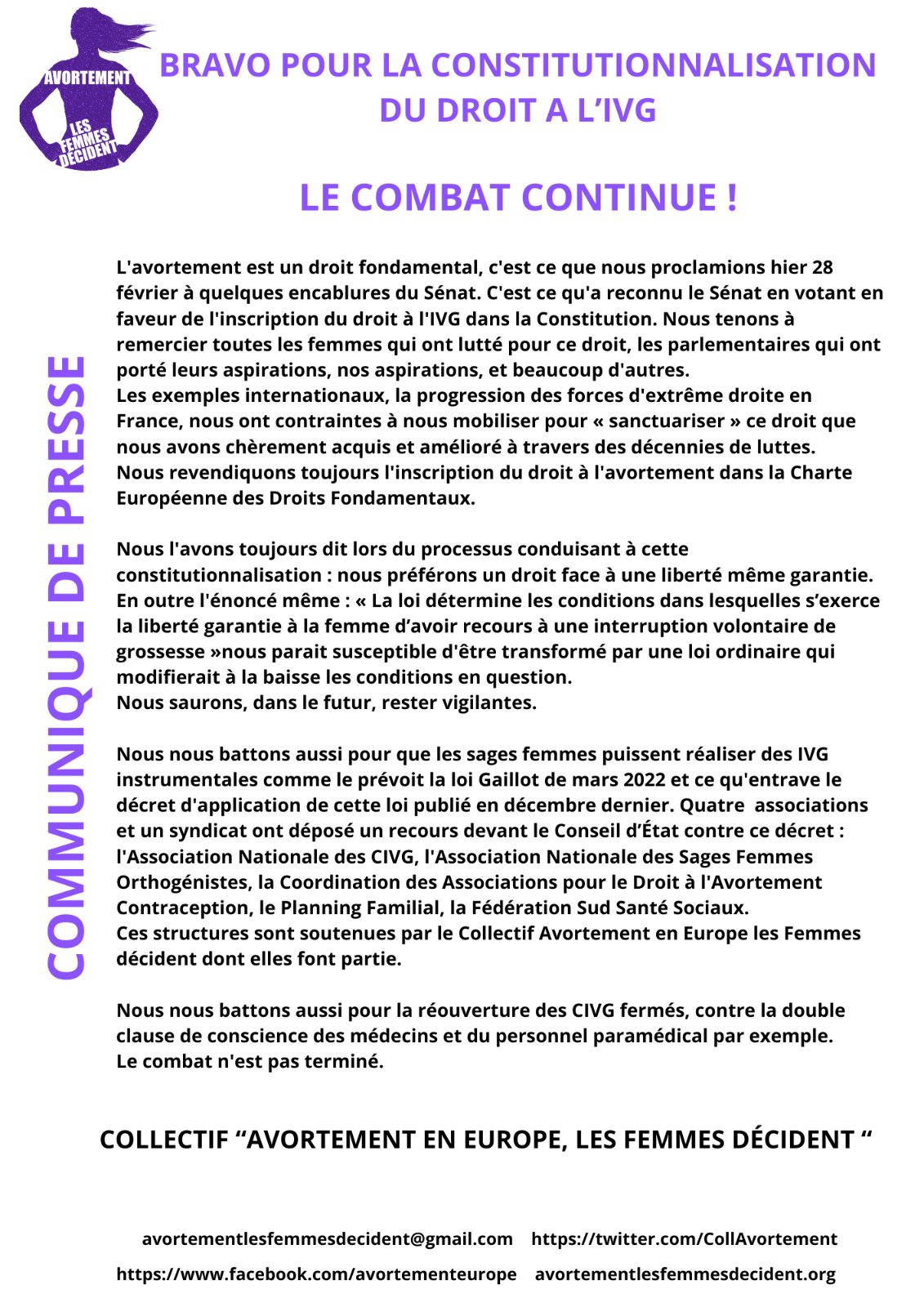 L'avortement est un droit fondamental, c'est ce que nous proclamions hier 28 février à quelques encablures du Sénat. C'est ce qu'a reconnu le Sénat en votant en faveur de l'inscription du droit à l'IVG dans la Constitution. Nous tenons à remercier toutes les femmes qui ont lutté pour ce droit, les parlementaires qui ont porté leurs aspirations, nos aspirations, et beaucoup d'autres.