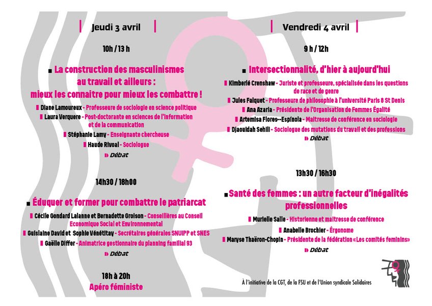 Alors que les droits des femmes sont partout remis en cause, ces deux journées de formation intersyndicale donnent la parole à des chercheuses, des militantes associatives et syndicales, et des femmes concernées sur quatre thèmes féministes. Elles permettent à l’ensemble des participantes de se retrouver pour réfléchir, échanger, s’organiser et s’armer pour porter ces questions dans nos organisations syndicales respectives et au-delà. Elles mettent aussi en lumière la manière dont la domination patriarcale s’exerce sur nos vies entières et démontrent que les luttes pour l’égalité professionnelle comme celles contre les violences sexistes et sexuelles sont des enjeux profondément sociaux et syndicaux.