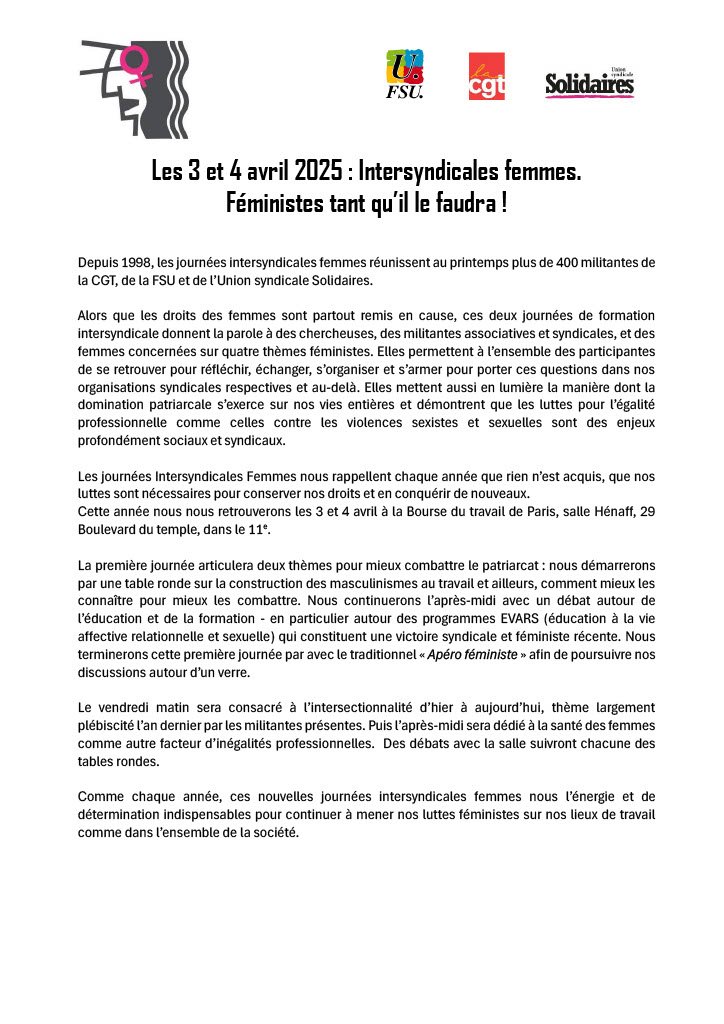 Comme chaque année, ces nouvelles journées intersyndicales femmes nous l’énergie et de détermination indispensables pour continuer à mener nos luttes féministes sur nos lieux de travail comme dans l’ensemble de la société.