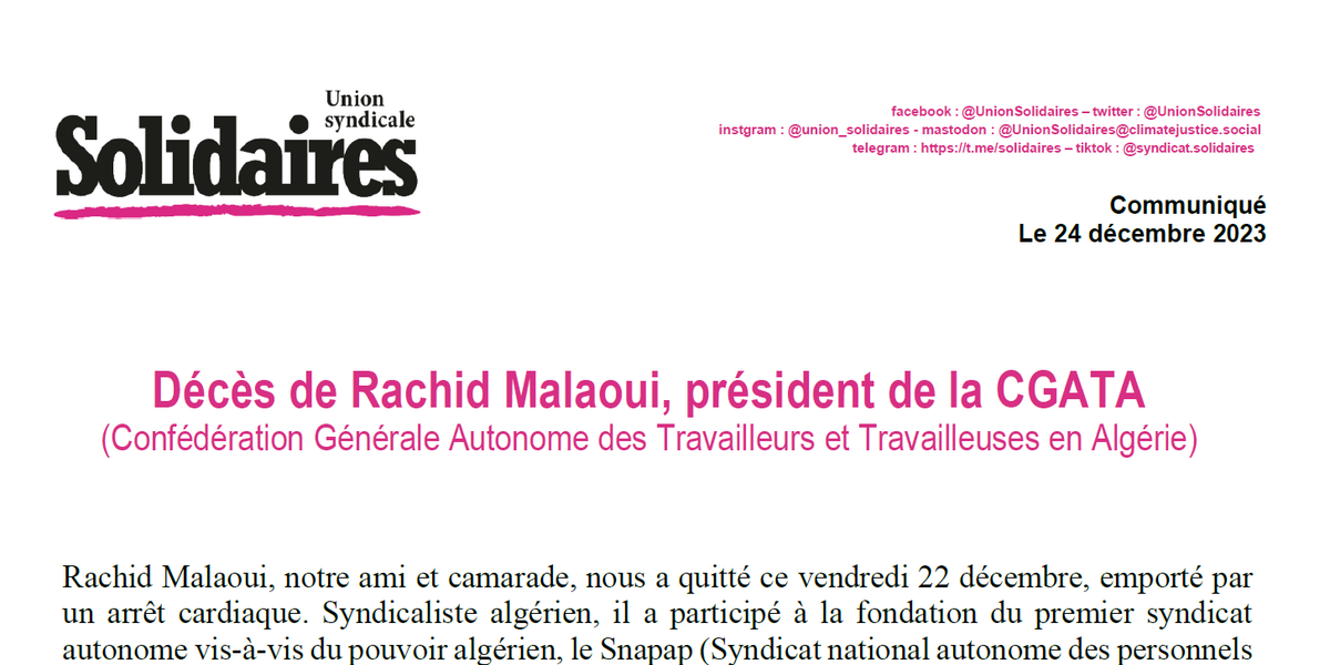 L'Union syndicale Solidaires partage les principes et revendications des syndicats autonomes algériens et lutte à leur côté depuis une première rencontre en 2005. Depuis, l'amitié entre nos organisations n'a cessé de se renforcer et de se concrétiser par des rencontres et des mobilisations communes, pour les droits et la justice sociale. Cette relation forte de solidarité et de luttes ne s'éteindra pas avec la disparition de Rachid.