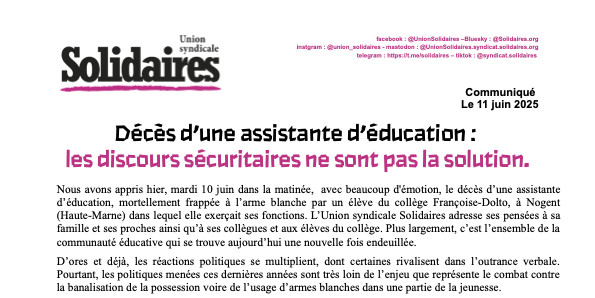 L’Union syndicale Solidaires adresse ses pensées à sa famille et ses proches ainsi qu’à ses collègues et aux élèves du collège. Plus largement, c’est l’ensemble de la communauté éducative qui se trouve aujourd’hui une nouvelle fois endeuillée.