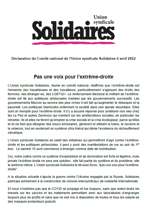 L’Union syndicale Solidaires, réunie en comité national, réaffirme que l’extrême-droite est l’ennemie des travailleuses et des travailleurs, particulièrement s’agissant des droits des femmes, des étranger-es, des LGBTQI+. Le renforcement électoral et militant de l’extrême-droite est lié aux politiques antisociales menées par les gouvernements successifs. Les gouvernements Macron au service des plus riches n’ont fait qu’augmenter le désespoir et la pauvreté. Les politiques liberticides enferment la société dans une spirale sécuritaire. Elles sont un tremplin pour l’extrême-droite. Il n’y a aucune réponse pour améliorer nos vies chez les Le Pen et autres Zemmour qui mentent sur les améliorations sociales, en particulier les retraites. Ils et elles ne feront qu’empirer la crise sociale et la crise écologique, parce qu’elles et ils ne font que désigner des boucs émissaires, génèrent et attisent la haine, le racisme et la violence, tout en soutenant un système ultra libéral qui dénie l’existence du réchauffement climatique.