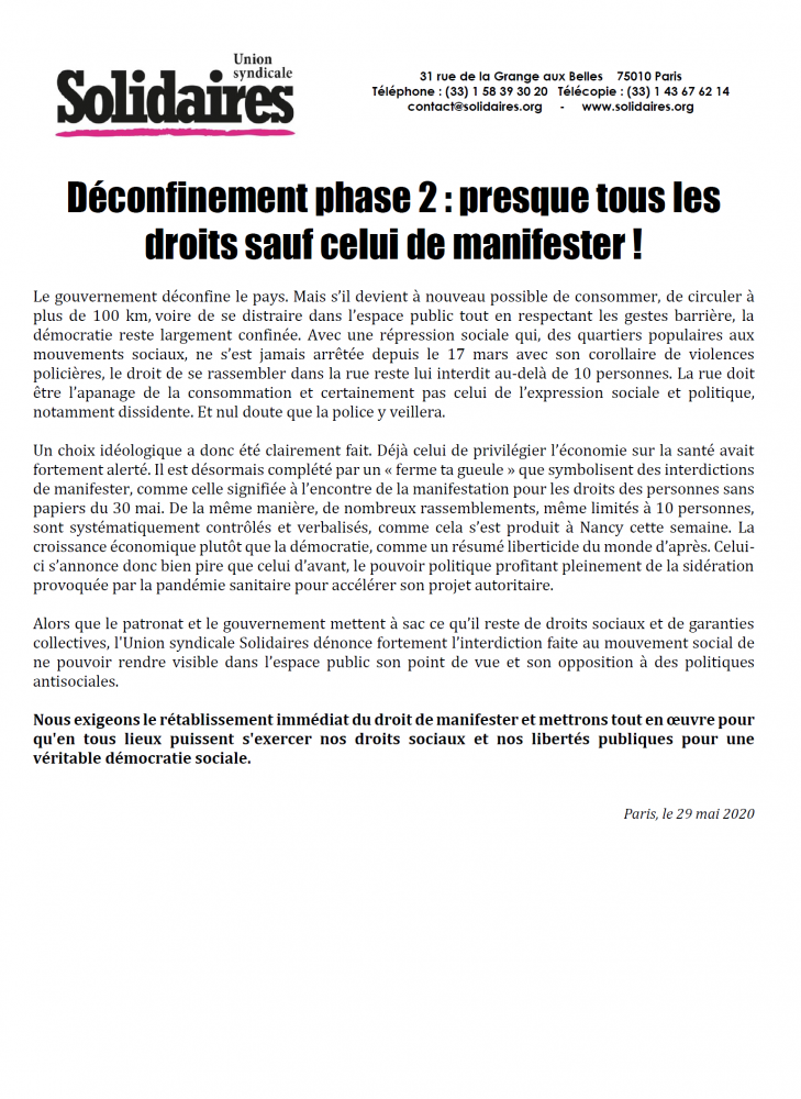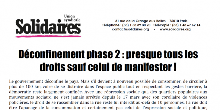 Alors que le patronat et le gouvernement mettent à sac ce qu’il reste de droits sociaux et de garanties collectives, l'Union syndicale Solidaires dénonce fortement l’interdiction faite au mouvement social de ne pouvoir rendre visible dans l’espace public son point de vue et son opposition à des politiques antisociales.