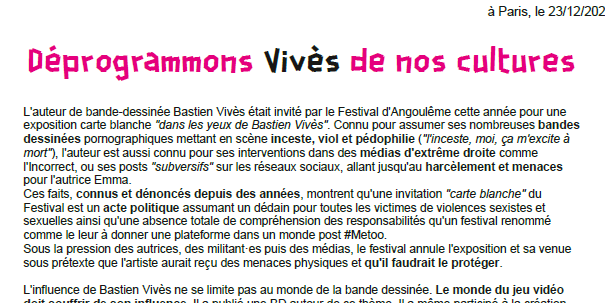 Les violences sexistes et sexuelles pour les travailleur-euses du monde de la culture et du divertissement sont trop courantes, et donner une plateforme à un auteur aux propos et productions telle que celles de Bastien Vivès montre une nouvelle fois que la mise en sécurité des femmes et personnes minorisées n’est pas une priorité.