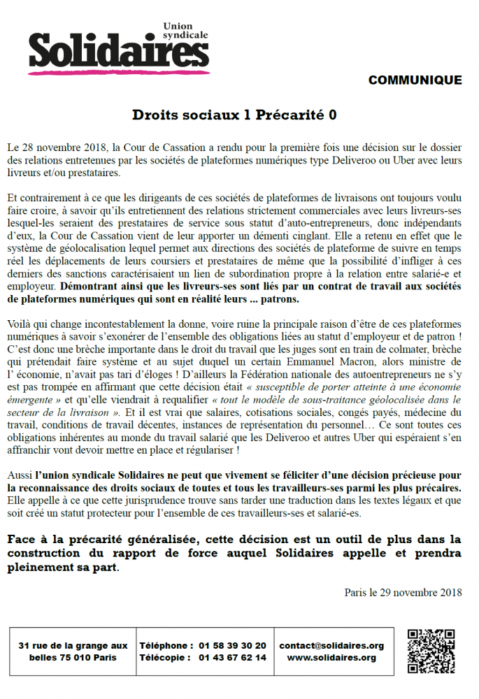 Voilà qui change incontestablement la donne, voire ruine la principale raison d’être de ces plateformes numériques à savoir s’exonérer de l’ensemble des obligations liées au statut d’employeur et de patron ! C’est donc une brèche importante dans le droit du travail que les juges sont en train de colmater, brèche qui prétendait faire système et au sujet duquel un certain Emmanuel Macron, alors ministre de l’ économie, n’avait pas tari d’éloges ! D’ailleurs la Fédération nationale des autoentrepreneurs ne s’y est pas trompée en affirmant que cette décision était « susceptible de porter atteinte à une économie émergente » et qu’elle viendrait à requalifier « tout le modèle de sous-traitance géolocalisée dans le secteur de la livraison ». Et il est vrai que salaires, cotisations sociales, congés payés, médecine du travail, conditions de travail décentes, instances de représentation du personnel… Ce sont toutes ces obligations inhérentes au monde du travail salarié que les Deliveroo et autres Uber qui espéraient s’en affranchir vont devoir mettre en place et régulariser !