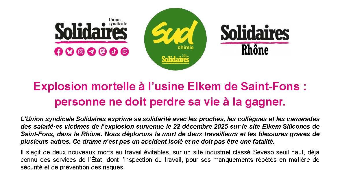 L’Union syndicale Solidaires exprime sa solidarité avec les proches, les collègues et les camarades des salarié·es victimes de l’explosion survenue le 22 décembre 2025 sur le site Elkem Silicones de Saint-Fons, dans le Rhône. Nous déplorons la mort de deux travailleurs et les blessures graves de plusieurs autres. Ce drame n’est pas un accident isolé et ne doit pas être une fatalité.