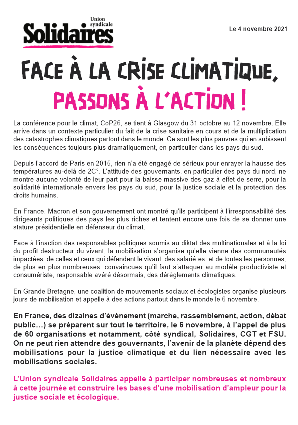 Depuis l’accord de Paris en 2015, rien n’a été engagé de sérieux pour enrayer la hausse des températures au-delà de 2C°. L’attitude des gouvernants, en particulier des pays du nord, ne montre aucune volonté de leur part pour la baisse massive des gaz à effet de serre, pour la solidarité internationale envers les pays du sud, pour la justice sociale et la protection des droits humains.