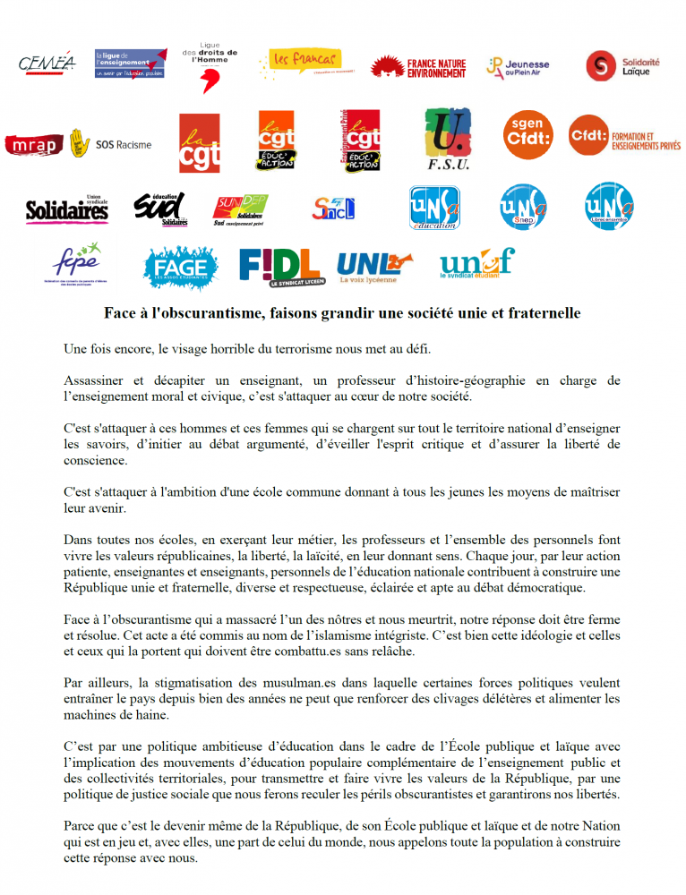 Parce que c’est le devenir même de la République, de son École publique et laïque et de notre Nation qui est en jeu et, avec elles, une part de celui du monde, nous appelons toute la population à construire cette réponse avec nous.