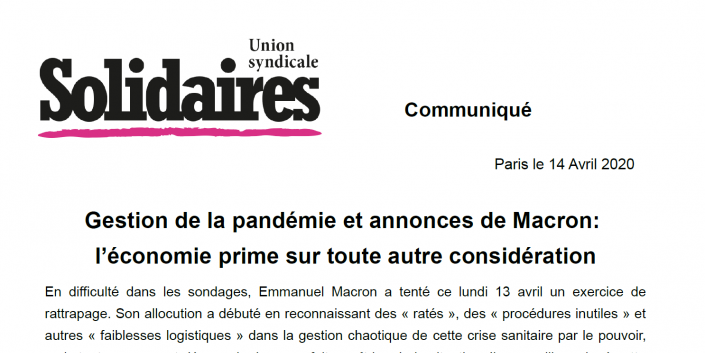 Renvoyant en grande partie l’après COVID à d’autres interventions dans les semaines à venir, E. Macron a donc prolongé d’un mois le confinement total, (en dehors des personnes dites vulnérables, sans qu’on sache d’ailleurs à partir de quel âge une personne sera considérée comme âgée), le 11 mai étant la date prévue pour engager un déconfinement progressif. Non sans contradictions difficilement compréhensibles : le travail va reprendre, mais les bars et restaurants, les musées, cinémas, théâtres et autres lieux culturels attendront en revanche le 15 juillet. Les établissements scolaires rouvriront progressivement à partir du 11 mai (sans précisions sur les modalités), mais pas les facs (les étudiant-es n’ont pas besoin d’être gardé-es pour que leurs parents travaillent?). Comment peut-on imaginer sérieusement la réouverture des crèches, écoles, collèges et lycées dans des conditions de sécurité optimale à partir du 11 mai? Les personnels de l’éducation devront-ils se sacrifier pour que les parents puissent retourner travailler et être à leur tour sacrifié-es sur l’autel de l’économie?