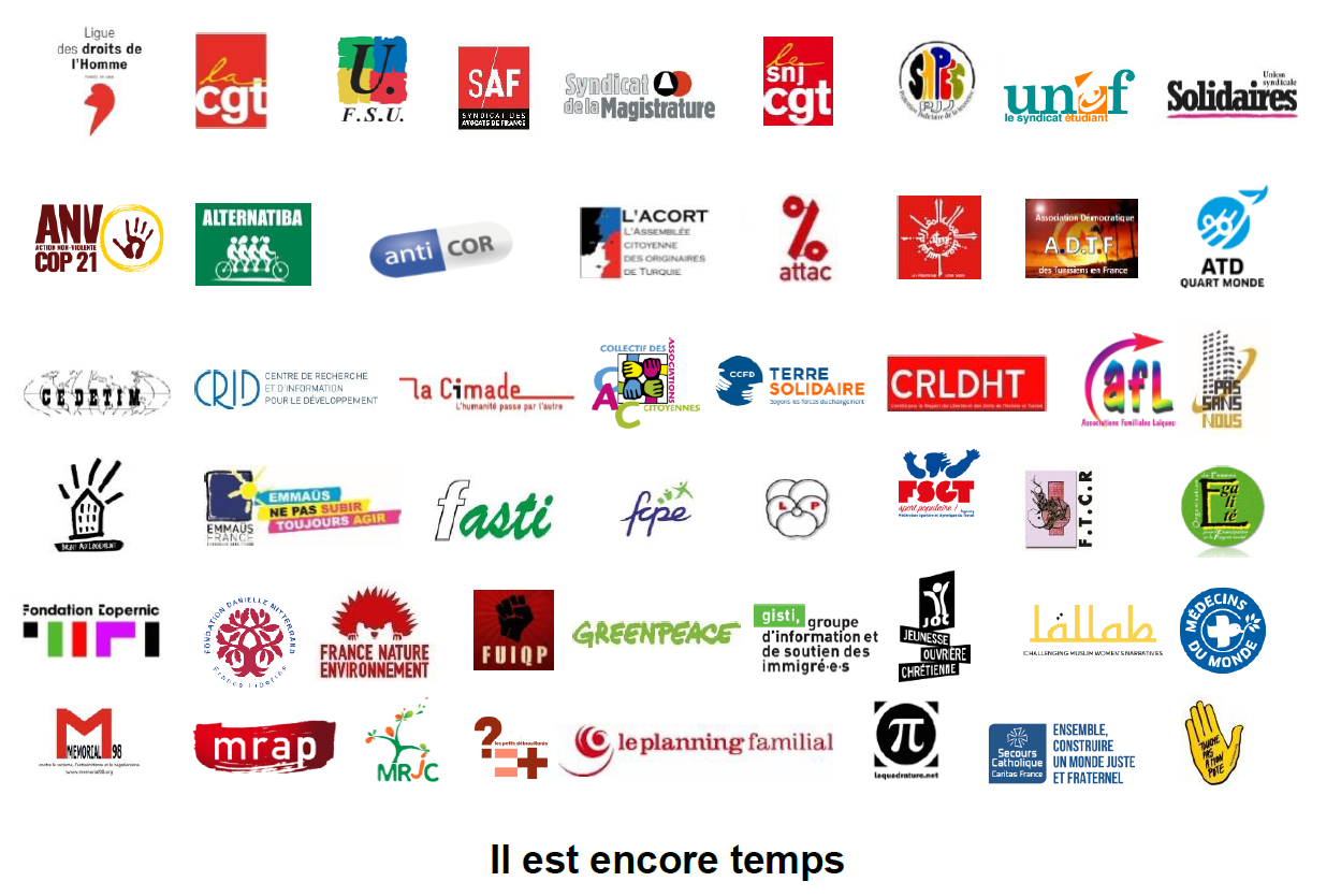 Ligue des droits de l'Homme (LDH), Confédération générale du travail (CGT), Fédération syndicale unitaire (FSU), Syndicat des avocats de France (Saf), Syndicat de la magistrature (SM), Syndicat national des journalistes (SNJ-CGT), Syndicat national des personnels de l'éducation et du social à la protection judiciaire de la jeunesse (SNPES-PJJ/FSU), Union nationale des étudiants de France (Unef), Union syndicale Solidaires, Action non violente – Cop21 (ANV-Cop21), Alternatiba, Anticor, Assemblée citoyenne originaires de Turquie (Acort), Association pour la taxation des transactions financières et pour l'action citoyenne (Attac), Association des travailleurs Maghrébins de France (ATMF), Association des Tunisiens de France (ADTF), ATD Quart monde, Centre d'études et d'initiatives de solidarité internationale (Cedetim), Centre de recherche et d’information pour le développement (Crid), la Cimade, Collectif des associations citoyennes (Cac), Comité catholique contre la faim et pour le développement (CCFD-Terre solidaire), Comité pour le respect des libertés et des droits de l'Homme en Tunisie (CRLDHT), Conseil national des associations familiales laïques (Cnafal), Coordination nationale Pas sans nous, Droit au logement (Dal), Emmaüs France, Fédération des associations de solidarité avec tous-tes les immigré-e-s (Fasti), Fédération des conseils de parents d'élèves (FCPE), Fédération nationale de la Libre Pensée, Fédération sportive et gymnique du travail (FSGT), Fédération des Tunisiens pour une citoyenneté des deux rives (FTCR), Femmes égalité, Fondation Copernic, Fondation Danielle Mitterrand, France nature environnement (FNE), Front uni des immigrations et des quartiers populaires (FUIQP), Greenpeace France, Groupe d'information et de soutien des immigrés (Gisti), Jeunesse ouvrière chrétienne (Joc), Lallab, Médecins du Monde, Memorial 98, Mouvement contre le racisme et pour l'amitié entre les peuples (Mrap), Mouvement rural de jeunesse chrétienne (MRJC), les Petits débrouillards, le Planning familial, la Quadrature du net, Secours catholique - Caritas France, SOS Racisme.Signatures individuelles, premiers signataires :